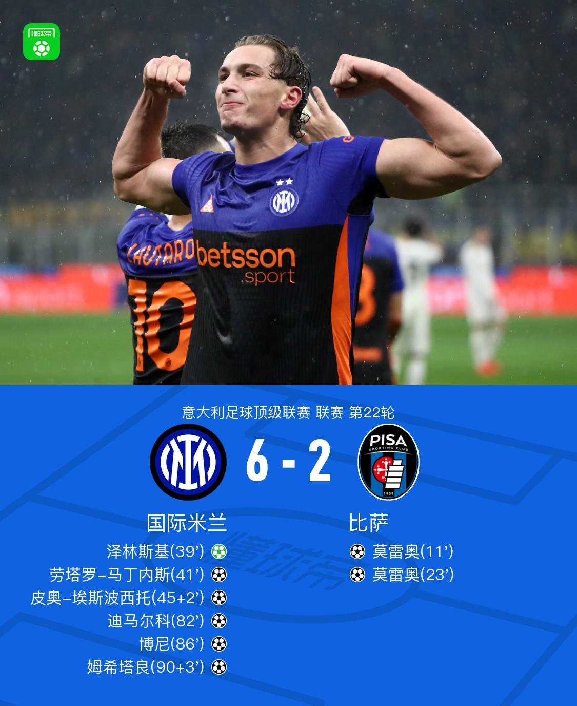 北京时间1月24日,意大利足球顶级联赛意甲联赛第22轮,国际米兰主场对阵比萨。上半场莫雷奥头顶脚踢梅开二度,泽林斯基点射破门,劳塔罗头球建功,皮奥头球反超,下半场迪马尔科弹射得分,博尼低射破门,姆希塔良锁定胜局。最终,国际米兰6比2战胜比萨。关键事件第11分钟,索默传球被断,莫雷奥迎球直接吊射破门,国米0-1比萨第23分钟,莫雷奥禁区争顶角球头球破门,国米0...